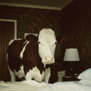 Me incorporé de un salto y me quedé con la espalda pegada a la cabecera de la cama. No podía apartar los ojos del animal que ocupaba buena parte de la habitación. No hace falta decir que la pregunta que surcaba mi mente de derecha izquierda y de arriba abajo era ¿qué hace una vaca en mi habitación? Y por lo visto la vaca la leyó en mi cara.